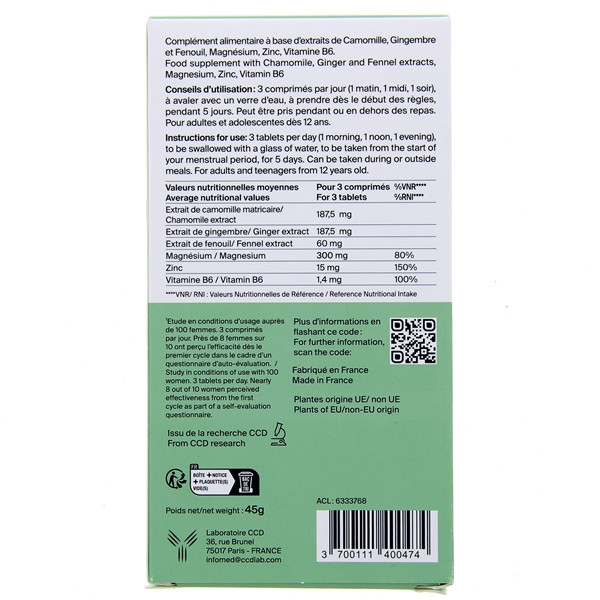 La camomille, riche en antioxydants naturels favorise la relaxation et le confort mental et physique. Le gingembre possède également des propriétés antioxydantes qui contribuent au bien-être physique et au fonctionnement normal du tube digestif. Quant au fenouil, ce légume méditerranéen a des graines à action antioxydante qui apportent du confort pendant les règles. De leur côté, le magnésium, le zinc et la vitamine B6 contribuent respectivement à la réduction de la fatigue, à procurer des fonctions physiologiques normales, à protéger les cellules contre le stress oxydatif et à réguler l’activité hormonale.
