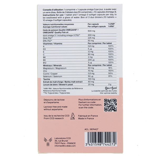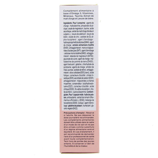 Maltodextrine, Phosphate dicalcique ; Oxyde de magnésium, Taurine, Acide ascorbique, Extrait de malt d'orge (Hordeum vulgare L.), Levure de sélénium, Levure de bière, Oxyde de zinc, Acétate de DL-Alpha-Tocopherol, Agent d'enrobage : Hydroxypropylméthylcellulose (E464), Agent de charge : Amidon alimentaire modifié (E1451), Antiagglomérant : Mono et Diglycérides d'acides gras, Agent d'enrobage : Cellulose microcristalline (E460), Antiagglomérant : Stéarate de magnésium (E470b), Gluconate de cuivre, Agent de charge : Maltodextrine de pomme de terre (E1400), Agent texturant : Gélatine, Chlorhydrate de pyridoxine ; Agents de charge : Amidon de maïs, Sucrose ; Acétate de rétinol, Antiagglomérant : Silice colloïdale (E551) [Nano], Acide folique ; Correcteurs d'acidité : Citrate trisodique (E331), Ascorbate de sodium (E301) ; Antiagglomérant : Triglycérides à chaînes moyennes, Conservateur : Butylhydroxytoluène (E321), Correcteur d'acidité, Acide citrique (E330), DL-alpha-tocophérol, Cholécalciférol, Cyanocobalamine.