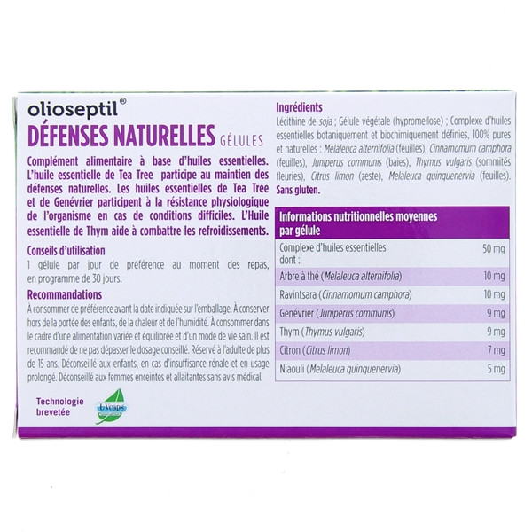 Défenses Naturelles gélules végétales sont fabriquées en France par Olioseptil des laboratoires Ineldea. Cette marque développe une gamme de compléments alimentaires qui combinent les propriétés bénéfiques de différentes huiles essentielles pour une action renforcée sur l’organisme.