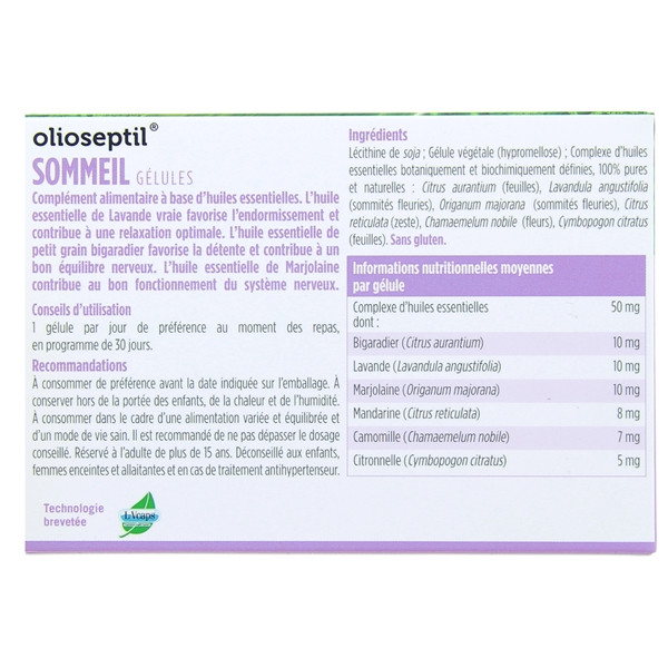 Les gélules végétales Sommeil Olioseptil sont formulées à base d’un complexe aromathérapique d’huiles essentielles choisies pour leurs vertus et leurs effets complémentaires. La lavande vraie aide à se relaxer et accélère le temps d’endormissement. Le petit grain bigaradier et la marjolaine contribuent à la détente et à l’équilibre du système nerveux. La mandarine, la camomille et la citronnelle complètent la composition pour optimiser les propriétés des ingrédients de ce produit conçu pour la détente et le sommeil. Les huiles essentielles sont d’abord micro-émulsionnées avec de l’huile d’olive avant d’être conditionnées sous forme de gélules végétales selon un processus breveté L-VCaps afin de simplifier leur consommation et d’accroître leur efficacité. Ces gélules sont disponibles en boîte de 30 unités sous blister.