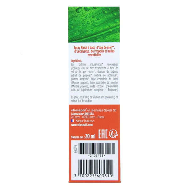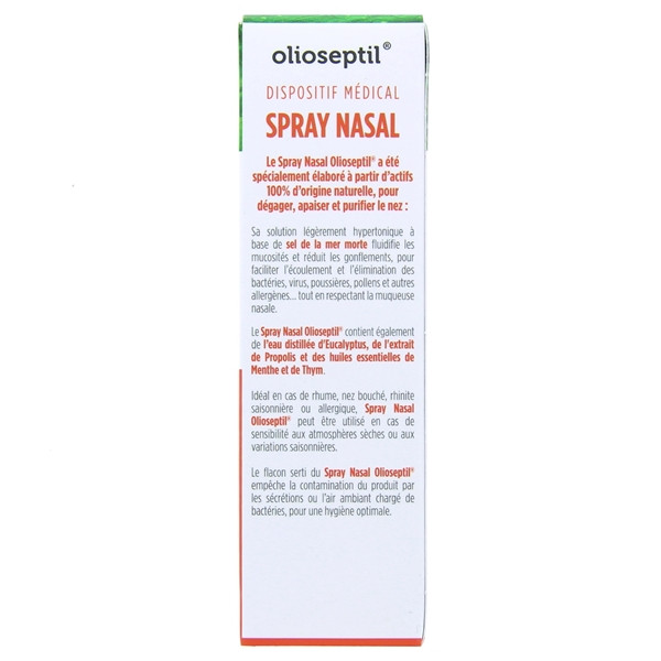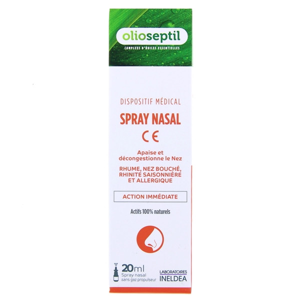 Le Spray Nasal Olioseptil représente la solution idéale pour traiter le rhume ou le nez bouché chez les personnes sensibles aux variations saisonnières et aux atmosphères sèches. Ce dispositif médical se compose essentiellement de sel de la Mer Morte qui s’avère particulièrement performant pour fluidifier les mucosités et réduire les gonflements des sinus. Ce spray contient également de l’eau distillée d’eucalyptus, de l’extrait de propolis, des huiles essentielles de menthe et de thym qui associent leurs vertus décongestionnantes, antiseptiques, antibactériennes, antivirales et anti-inflammatoires. Ce spray est doté d’un embout adapté aux narines et sa formule est exempte de gaz propulseur pour respecter la sensibilité des narines. Il est disponible en flacon-spray 20ml.