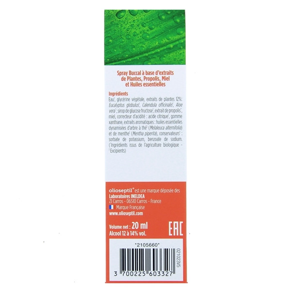 Le spray pour gorge et larynx des laboratoires Ineldéa Olioseptil est formulé à base d'extraits de plantes, de propolis, de miel et d'huiles essentielles pour soulager les irritations de la gorge.