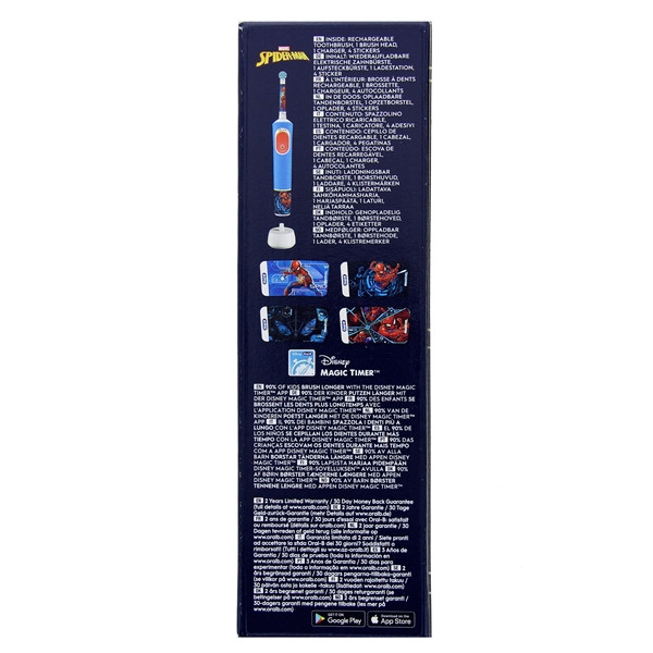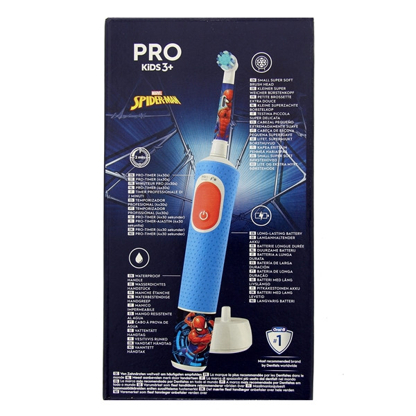 La brosse à dents électrique Oral-B Pro Kids 3+ Spider Man possède un minuteur et propose deux modes de nettoyage : sensibilité plus et le nettoyage quotidien. Elle permet de nettoyer délicatement et efficacement les dents des enfants dès 3 ans pour une hygiène bucco-dentaire optimale.
