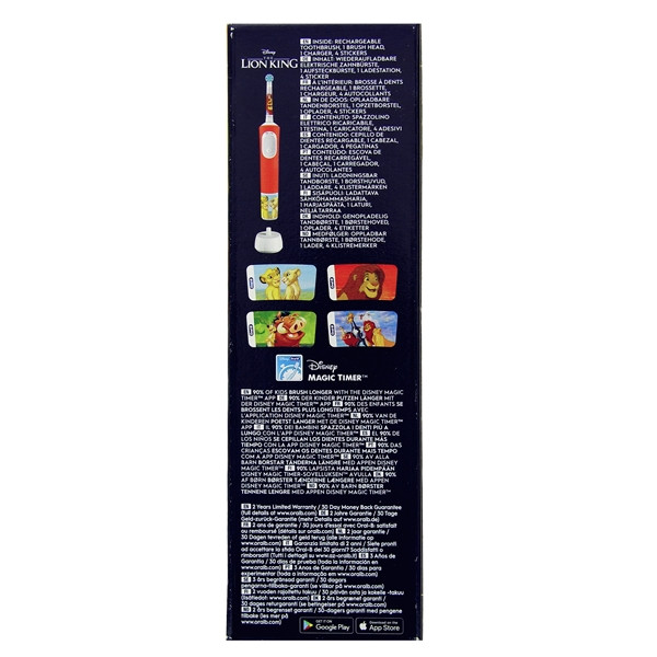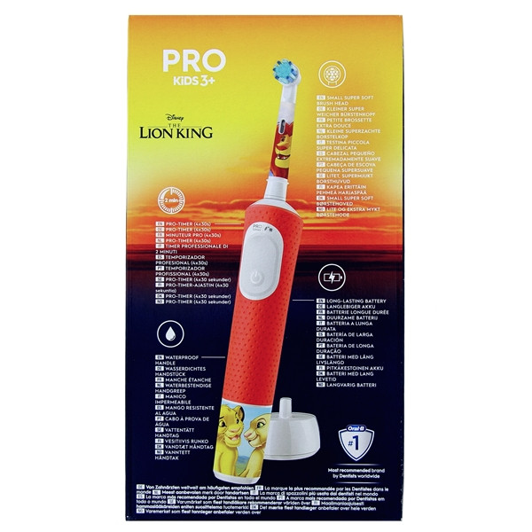 La brosse à dents électrique Oral-B Pro Kids 3+ Roi Lion possède une petite brossette extra douce, deux modes de nettoyage et un minuteur pour assurer un nettoyage efficace des dents des enfants dès 3 ans.
