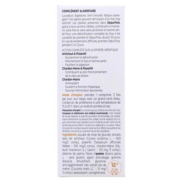 DépurFoie est déconseillé aux enfants de moins de 12 ans. Avant de prendre DépurFoie, il est recommandé aux femmes enceintes ou allaitantes de demander l’avis d’un professionnel de santé. Évitez de dépasser la posologie journalière prescrite de DépurFoie. Prenez soin de le tenir hors de la portée des enfants.