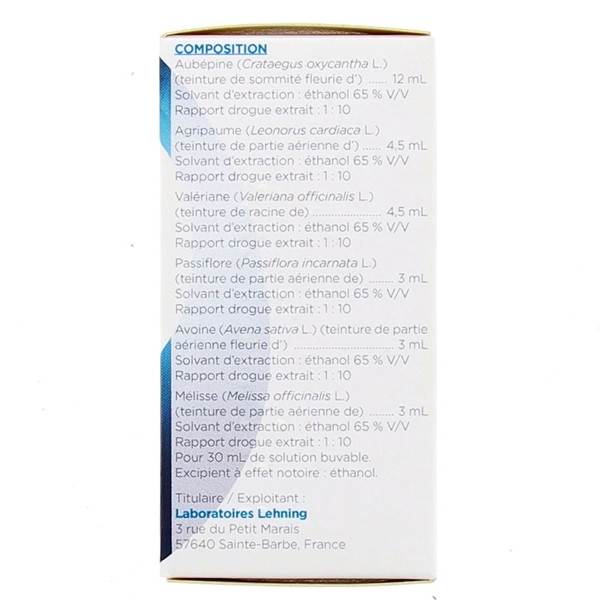 - Aubépine (extrait hydroalcoolique fluide de sommités fleuries et de fruits) : 12 ml