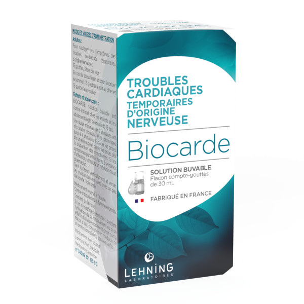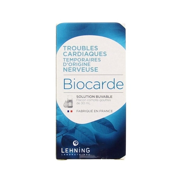 Biocarde est une solution buvable sous forme de gouttes destiné aux troubles cardiaques temporaires d'origine nerveuse. Il s'utilise aussi pour soulager les symptômes légers du stress et favoriser le sommeil.