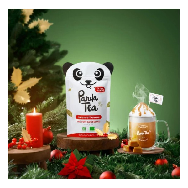 Le Thé Vert Caramel Lovers Bio de la marque Panda Tea associe du thé vert et du honeybush à des notes de caramel et d'épices pour une pause gourmande et apaisante.