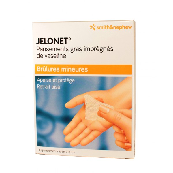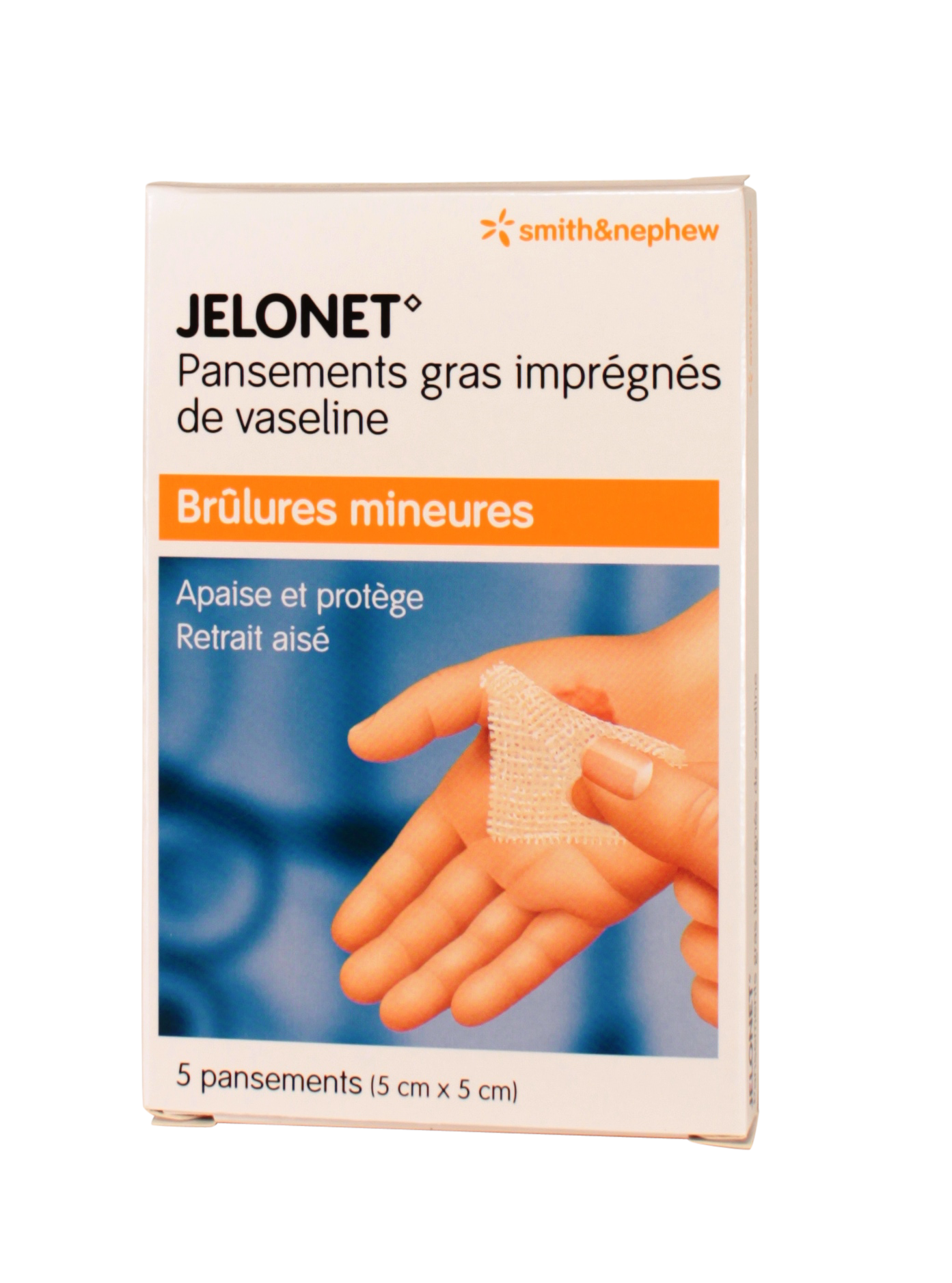 Les Laboratoires Smith & Nephew développent le pansement gras Jelonet. Diponible en boîte de 10 unités. Ces pansements sont imprégnés de vaseline pour soigner les brûlures mineures. Chaque pansement gras est présenté sous sachet individuel stérilisé aux rayons gamma. Il est ainsi conseillé pour traiter des plaies ouvertes et des brûlures. Il est également conçu avec un support aéré à large maille afin de drainer plus facilement les exsudats, évitant ainsi tout risque de macération. Le pansement gras Jelonet bénéficie enfin d'une haute tolérance cutanée.