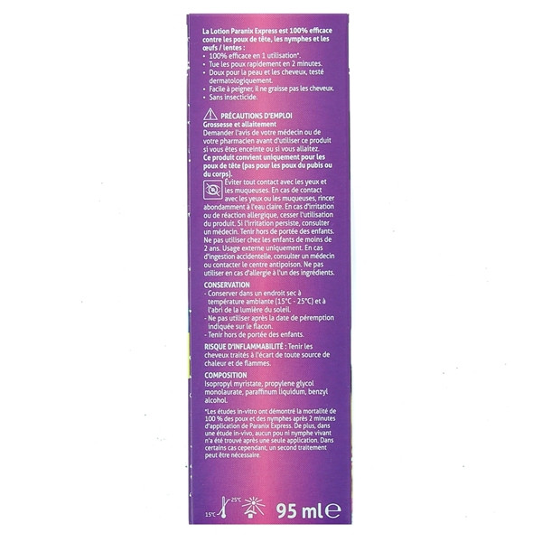 La Lotion Express Action Rapide Anti-Poux de Paranix élimine 100 % des poux et des lentes en 1 seule application et dès 2 minutes. Sa formule agit à tous les stades de développement du pou et élimine larves, lentes et poux adultes.