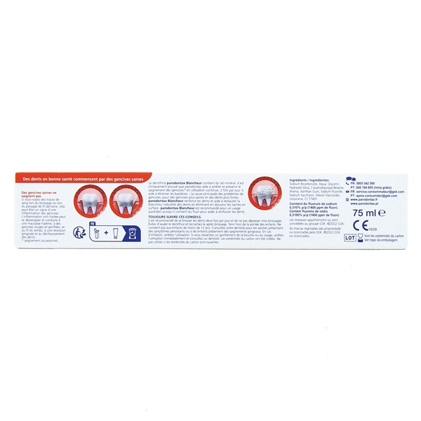 Il est recommandé de recracher le Dentifrice Blancheur après le brossage, en évitant de l’avaler. Ce produit est déconseillé aux utilisateurs de moins de 12 ans, il est indiqué de tenir le dentifrice Parodontax hors de la portée des enfants. Arrêtez l’usage de ce dentifrice en cas d’irritation ou de gonflement dans la zone buccale.