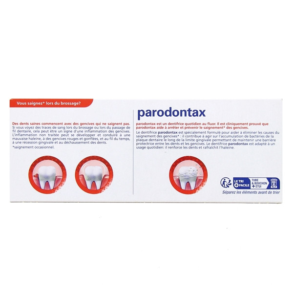Ce dentifrice Protection Fluor Parodontax est conseillé en cas de gencives qui saignent occasionnellement. Grâce à sa formule unique avec du bicarbonate de sodium et du fluor, l'utilisation quotidienne du dentifrice Parodontax favorise la réduction des saignements occasionnels tout en luttant contre les caries.