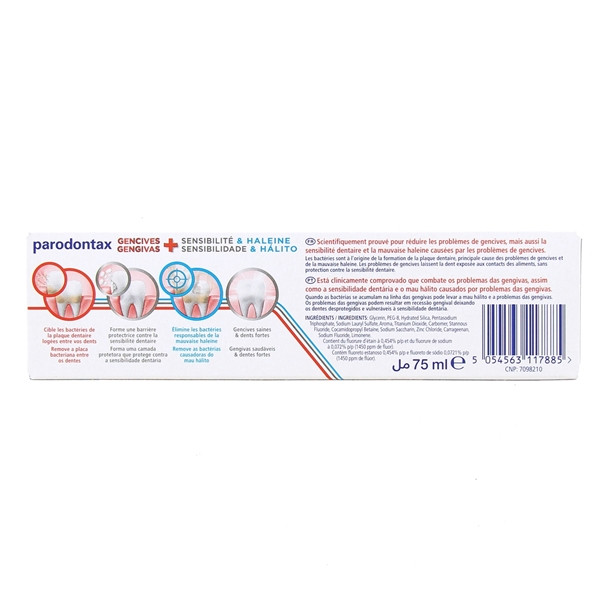 Le dentifrice Gencives + Sensibilité & Haleine Parodontax est un dentifrice quotidien au fluor complet pour la santé bucco-dentaire. Il contribue à réduire les problèmes de gencives ainsi que la sensibilité dentaire et la mauvaise haleine causées par ces problèmes.