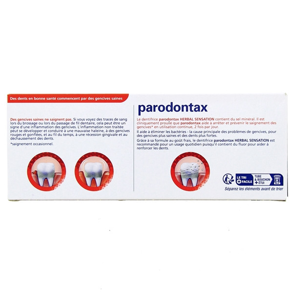 Le dentifrice Herbal Sensation Parodontax au goût de menthe et de mélisse aide à arrêter et à prévenir le saignement occasionnel des gencives. De plus, ce dentifrice contient du fluor pour renforcer les dents et lutter contre les caries.