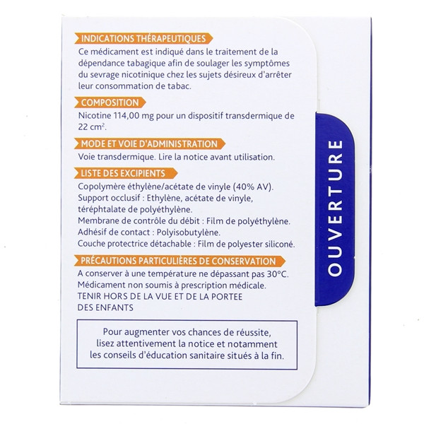 Ce médicament aide les fumeurs à se désintoxiquer du tabac. Le dispositif transdermique (timbre) contient de la nicotine, principale substance active du tabac ; celle-ci traverse la peau, gagne le sang et agit sur le système nerveux, permettant ainsi au fumeur de ne pas ressentir les symptômes dus à l'arrêt du tabac.