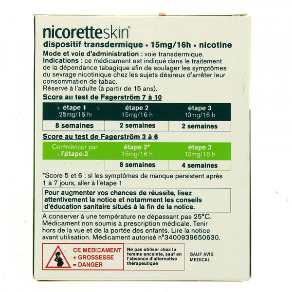 | Nicotine libérée/16 h | 10 mg | 15 mg | 25 mg |