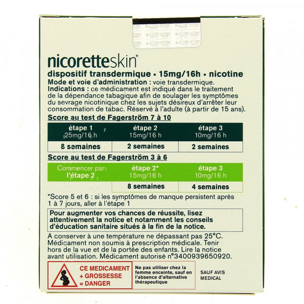 | Nicotine libérée/16 h | 10 mg | 15 mg | 25 mg |