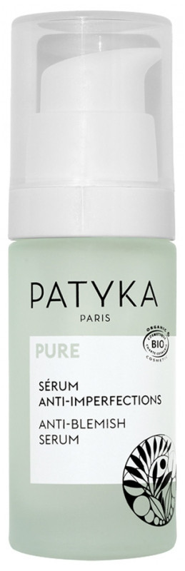 Pure Sérum Anti-Imperfections Bio de la marque Patyka est un soin triple action indispensable pour les peaux mixtes à grasses. Elle prévient, corrige et réduit les boutons, les points noirs, les pores dilatés et les marques d'acné.