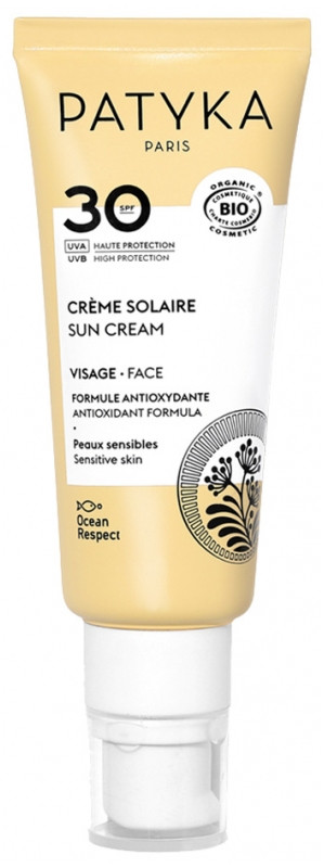 La Crème Solaire Visage SPF30 Bio de la marque Patyka assure une protection efficace de la peau du visage contre les rayons UVA/UVB. Cette crème résiste à l'eau et convient aux peaux sensibles.
