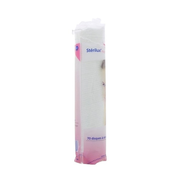 Il est conseillé de déposer directement le produit démaquillant ou le soin pour le visage sur le disque de coton à démaquiller x70 Stérilux. Il est recommandé de procéder au nettoyage en frottant délicatement le produit d’hygiène Stérilux sur votre visage. N’hésitez pas à changer de disque de coton Stérilux si le maquillage est tenace.