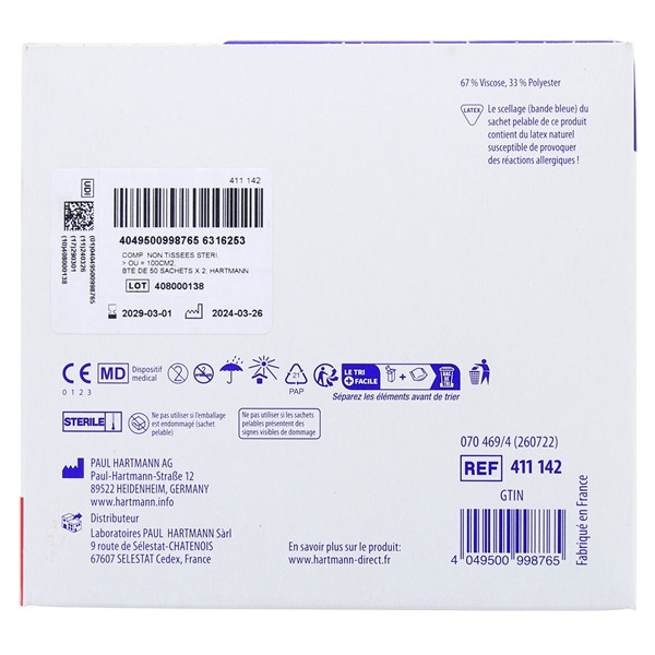 Medicomp Compresses stériles non tissées 10 x 10 cm est destiné à un usage unique. En effet, il est déconseillé de réutiliser les compresses Hartmann au risque de provoquer des infections. La composition de ce dispositif médical Hartmann contient du latex naturel susceptible de causer des réactions allergiques.