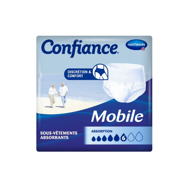 Des laboratoires Hartmann, les sous-vêtements absorbants Confiance Mobile 6G s’adressent à toute personne, homme ou femme, en déplacement et/ou souffrant d’incontinence urinaire modérée. Ils conviennent également aux sujets désorientés ou atteints de certaines maladies comme l’Alzheimer. Ce sont des dispositifs médicaux réglementés portant le marquage CE.