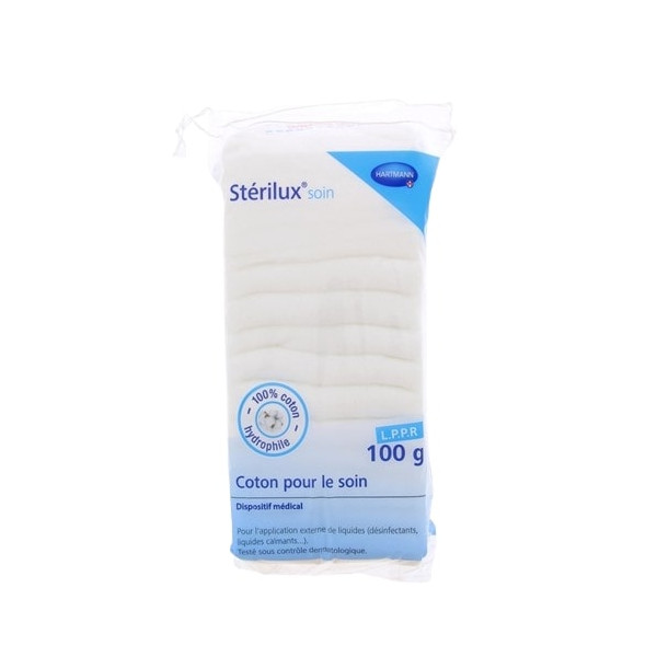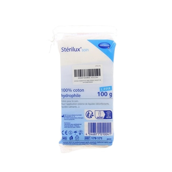 Stérilux Coton pour le soin Hydrophile 100g de la marque Paul Hartmann est conçu pour l’application de produits de soin liquides pour usage externe, tels que les médicaments apaisants en cas de plaies, les lotions pour le visage. Il est indiqué pour étaler uniformément un produit nettoyant et désinfectant sur la peau. Il est pris en charge par l’assurance maladie.