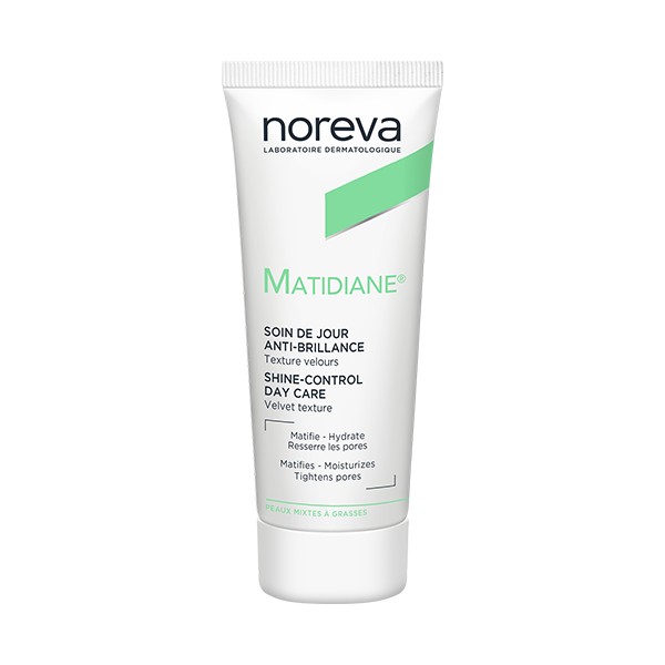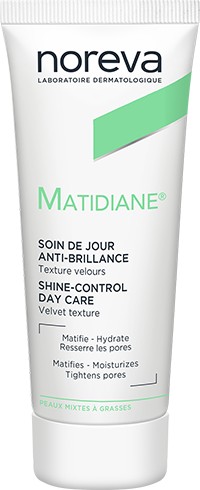 Matidiane Soin de jour anti-brillance des laboratoires Noreva présente une formule originale qui resserre les pores, ré-oxygéne la peau et unifie le teint grâce à une concentration en Chrono Regul HD, une exfoliation enzymatique douce (esters de BHA), le lipid Binder, un extrait de lotus blanc (détoxifiant) et des agents hydratants.