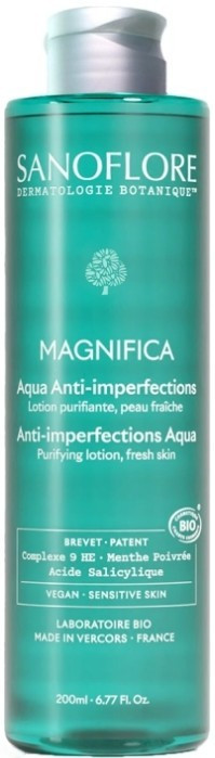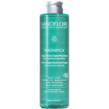 Aqua Anti-Imperfections Bio de la gamme Magnifica du laboratoire botanique Sanoflore est une lotion purifiante pour les peaux normales, mixtes et grasses à tendance acnéique. Cette lotion anti-imperfection purifie, matifie, lisse, régule la peau et resserre les pores.