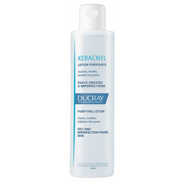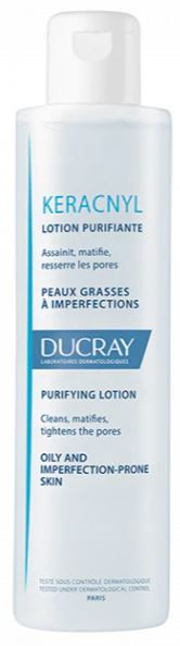 Keracnyl lotion purifiante élaborée par le laboratoire Ducray est recommandée pour le traitement des peaux grasses à imperfections. Grâce à ses actifs, elle garantit trois actions complémentaires : l'assainissement, la matification et le resserrage des pores pour une purification cutanée idéale.