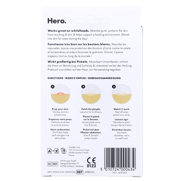 Mighty Patch Invisible+ Hero Cosmetics est un patch de jour anti-acné discret, qui passe inaperçu. Ce patch absorbe les impuretés du bouton en 6 à 8 h, le protège contre la saleté et les bactéries et aide à favoriser sa guérison.
