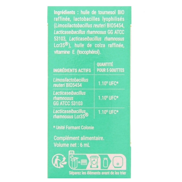 Lactobacilles lyophilisés : Limosilactobacillus reuteri BIO5454 - Lacticaseibacillus rhamnosus GG ATCC 53103 - Lacticaseibacillus rhamnosus Lcr35®, huile de tournesol BIO raffinée, huile de colza raffinée, tocophérol (vitamine E).