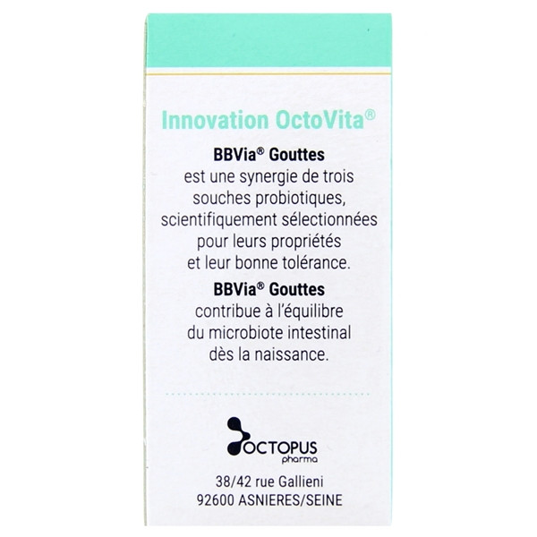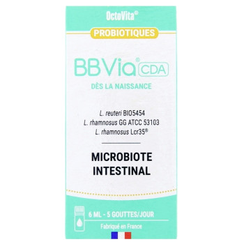BBVia CDA de la marque Octavita est un complément alimentaire sous forme de gouttes, formulé avec 3 souches probiotiques pour contribuer à l'équilibre du microbiote intestinal dès la naissance.