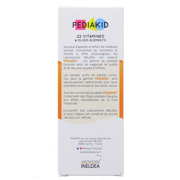 Le sirop Pediakid® aux 22 Vitamines & Oligo-éléments est un complément alimentaire proposé par le laboratoire Ineldea. Composé d'une association d'extrait de Cresson, d'Épinard, de Persil, de Betterave, de Carotte, de vitamine A, C, D, E, ainsi que de vitamine B1, B2, B3, B5 et B6, B8, B9, B12, ce complément alimentaire participe activement au bon fonctionnement de l'organisme des enfants et au maintien de leur équilibre général. Il contient également du Molybène, du cuivre, de l'iode et du Sélénium. Ces différents actifs permettent, en outre, au sirop Pediakid®, de renforcer les défenses immunitaires de l'organisme.