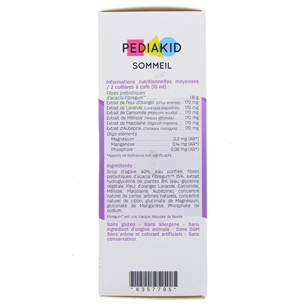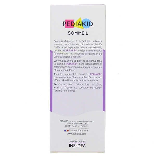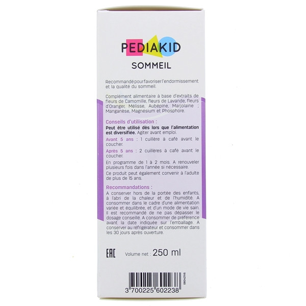 PEDIAKID Sommeil est un complément alimentaire, sous forme de sirop, au goût sirop, qui favorise l'endormissement et la qualité du sommeil chez l'enfant de plus de 5 ans et l'adulte.