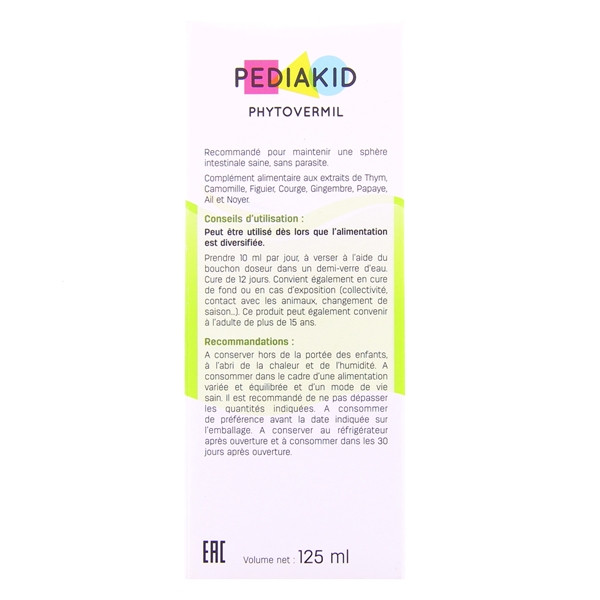 - Mélanger 10ml de Pediakid Phytovermil, en employant le bouchon doseur, avec un demi-verre d’eau. À donner à l’enfant 1 fois par jour, le matin de préférence, pendant 12 jours.