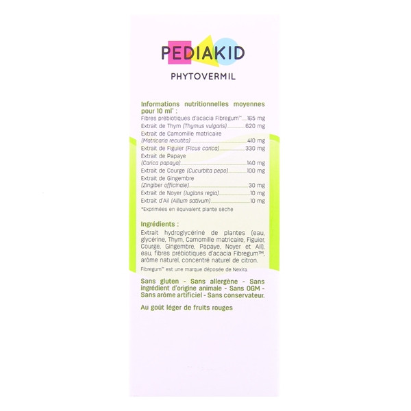 Phytovermil Pediakid a été formulé avec des extraits de plantes soigneusement sélectionnés pour leurs propriétés bénéfiques pour le système intestinal et pour leurs actions à la fois douces et performantes. Ce dispositif contient du thym, de la camomille, du figuier, de la courge, du gingembre, de l’ail, de la papaye et du noyer. À l’instar des solutions concentrées buvables de la marque, ce produit renferme également des fibres solubles d’acacia qui détiennent des vertus rééquilibrantes de la flore intestinale. Sa composition est exempte de trace de gluten, d’OGM, d’allergène, d’arôme artificiel ou d’ingrédient d’origine animale. Sa saveur légère et agréable de fruits rouges que les enfants aiment beaucoup est obtenue avec un arôme naturel. Conditionnement : flacon 125ml.