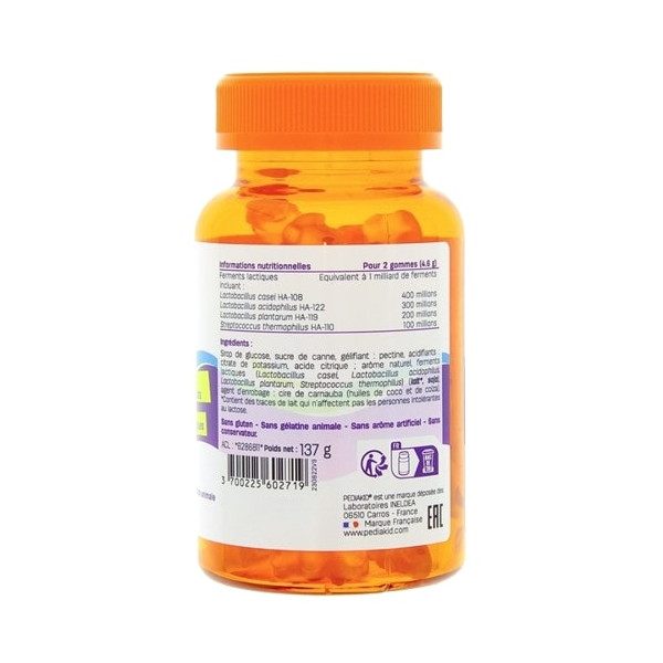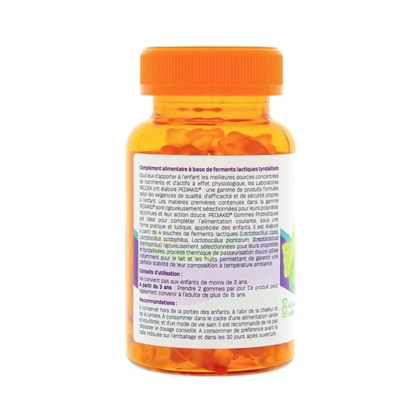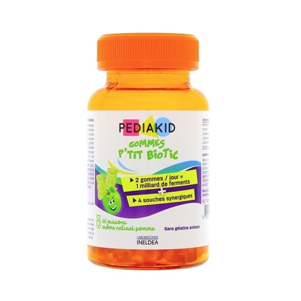Pediakid a développé le complément alimentaire P'tit BioTic en gomme ourson, une forme pratique et ludique. Les gommes Pediakid P'tit BioTic associent 4 souches de probiotiques à effet synergique (Lactobacillus acidophilus, Lactobacillus casei, Lactobacillus plantarum, Streptococcus thermophilus).