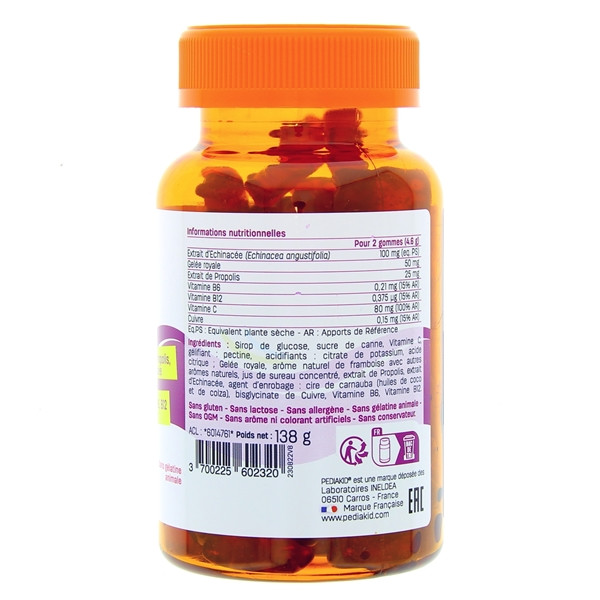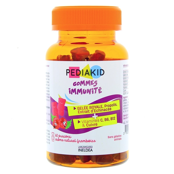 Pediakid a développé le complément alimentaire Immunité en gomme ourson, une forme pratique et ludique. Les gommes Pediakid Immunité sont formulés à base de gelée royale, d'extrait d'echinacée, de propolis, de vitamines et de cuivre pour soutenir le système immunitaire des enfants dès 3 ans.