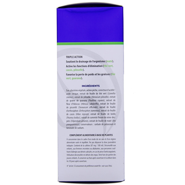 Eau, glycérine végétale, arôme pêche. Correcteur d’acidité : acide citrique. Extrait de feuille de thé vert (Camellia sinensis), extrait de piloselle (Hieracium pilosella), extrait de graine de guarana (Paullinia cupana), extrait de fleur d’hibiscus (Hibiscus sabdariffa), extrait de feuille de pissenlit (Taraxacum officinale), extrait de feuille d’orthosiphon (Orthosiphon stamineus), extrait de feuille de cassis (Ribes nigrum), extrait de feuille de boldo (Peumus boldus), extrait de sommité fleurie de reine-des-prés (Filipendula ulmaria), extrait de feuille de maté (Ilex paraguariensis). Conservateurs : sorbate de potassium et benzoate de sodium.