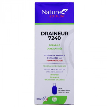Pharm Nature Draineur 7240 aide à drainer, éliminer et brûler les graisses. Il s’agit d’une formule concentrée, avec 10 extraits naturels de plantes, soit 7240 mg par jour. Programme de 14 jours. Arôme naturel de pêche. Sans édulcorant.