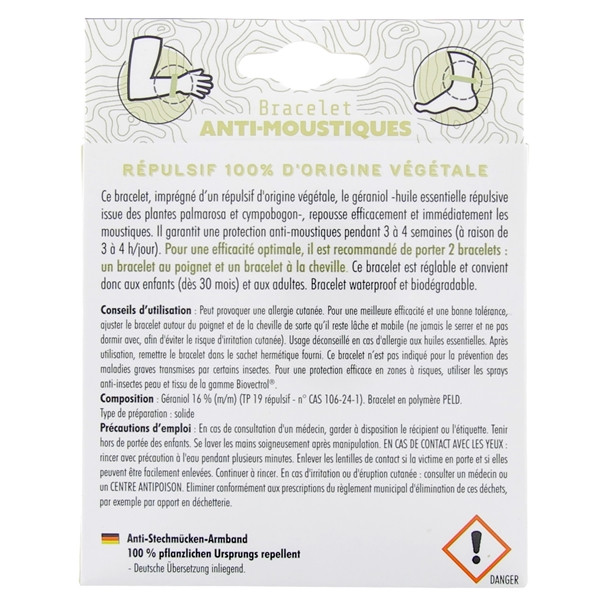Géraniol 16% (m/m) sur la partie active du bracelet.