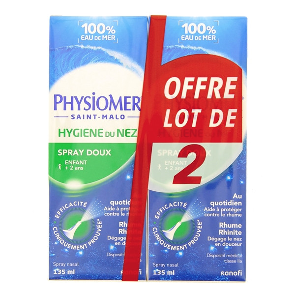 Le Spray Doux Hygiène du Nez, en lot de 2 sprays x 135ml, est fabriqué en France par la marque Physiomer qui élabore tous ses produits à partir de l’eau de mer collectée au large de la baie de Saint-Malo.