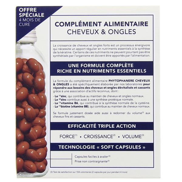 Phytophanère Cheveux & Ongles renforce les cheveux. Ce complément alimentaire favorise la croissance et augmente le volume de la chevelure et des ongles. Il contient une combinaison de nutriments dont le zinc, les vitamines B2, B5, B6, B8, C et E. Il renferme également de la levure de bière, de l’extrait d’acérola, des huiles de bourrache, de son de riz et de germes de blé.