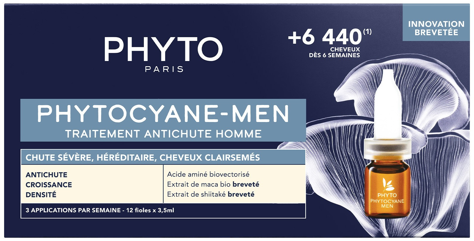 Ce Phytocyane contient notamment un extrait de maca bio breveté, un acide aminé biovectorisé et un extrait de shiitaké breveté. Le Maca jouit d’un effet ancrage. Il favorise la croissance et l’activation des cheveux de sorte à empêcher la chute progressive capillaire. L’acide aminé biovectorisé profite d’un effet antichute. Il agit sur l’enzyme 5-alpha réductase, connue pour miniaturiser le follicule pileux, de façon à arrêter la chute capillaire. Quant au Shiitake, il revitalise le follicule pileux affaibli pour rendre sa force à la chevelure.