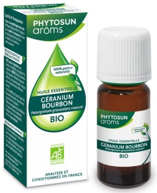 L'Huile Essentielle Géranium Bourbon Bio du laboratoire Phytosun Arôms est reconnue pour ses propriétés cicatrisantes, anti-infectieuses et astringentes afin de traiter des problème de peau. Elle possède aussi des propriétés anti-inflammatoires pour soulager des douleurs (articulation, rhumatisme, muscle).