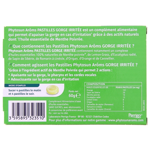 Les pastilles pour apaiser la gorge en cas d'irritation des laboratoires Phytosun Arôms contiennent des huiles essentielles reconnues pour apaiser et adoucir la gorge, le pharynx et les cordes vocales.