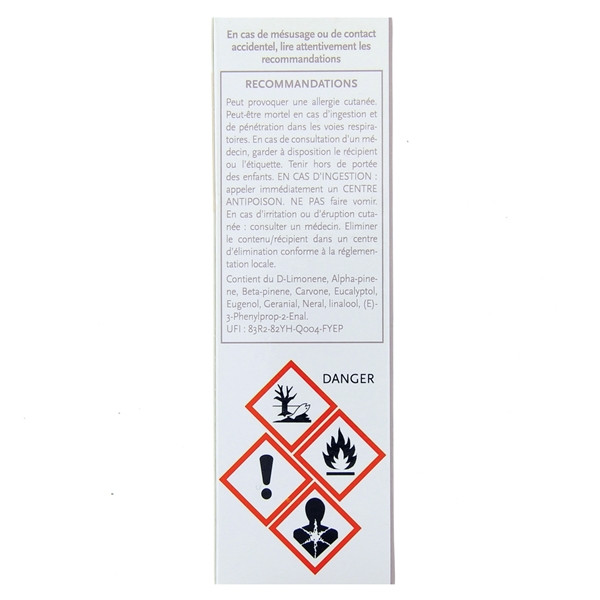 Huiles Essentielles : Orange Douce (Citrus sinensis), Citron Jaune (Citrus limonum), Romarin (Rosmarius officinalis), Menthe (Mentha viridis), Litsée (Litsea cubeba), Girofle Clous (Eugenia caryophyllata clous), Bois de Hô (Cinnamomum camphora), Cannelier de Chine (Cinnamomum cassia), Cannelle de Ceylan (Cinnamomum zeylanicum).