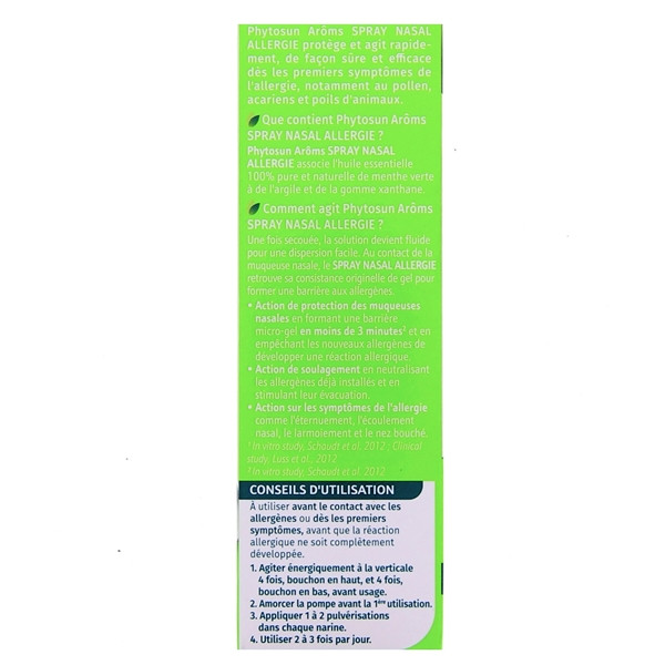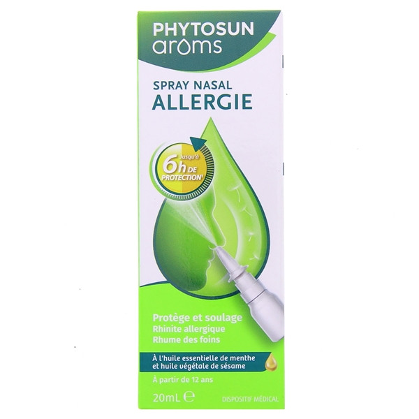 Le Spray Nasal Allergie de Phytosun Arôms soulage en cas de rhinite allergique et de rhume des foins. Il est formulé à l'huile essentielle de menthe verte et à l'huile végétale de sésame.