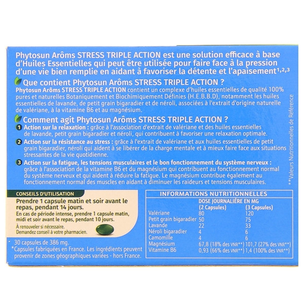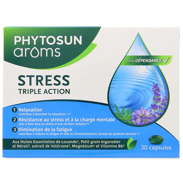 Stress Triples Action de Phytosun Arôms est un complément alimentaire à base d'huiles essentielles, d'extrait de valériane, de vitamine et de minéral pour favoriser la relaxation, lutter contre le stress et diminuer la fatigue.